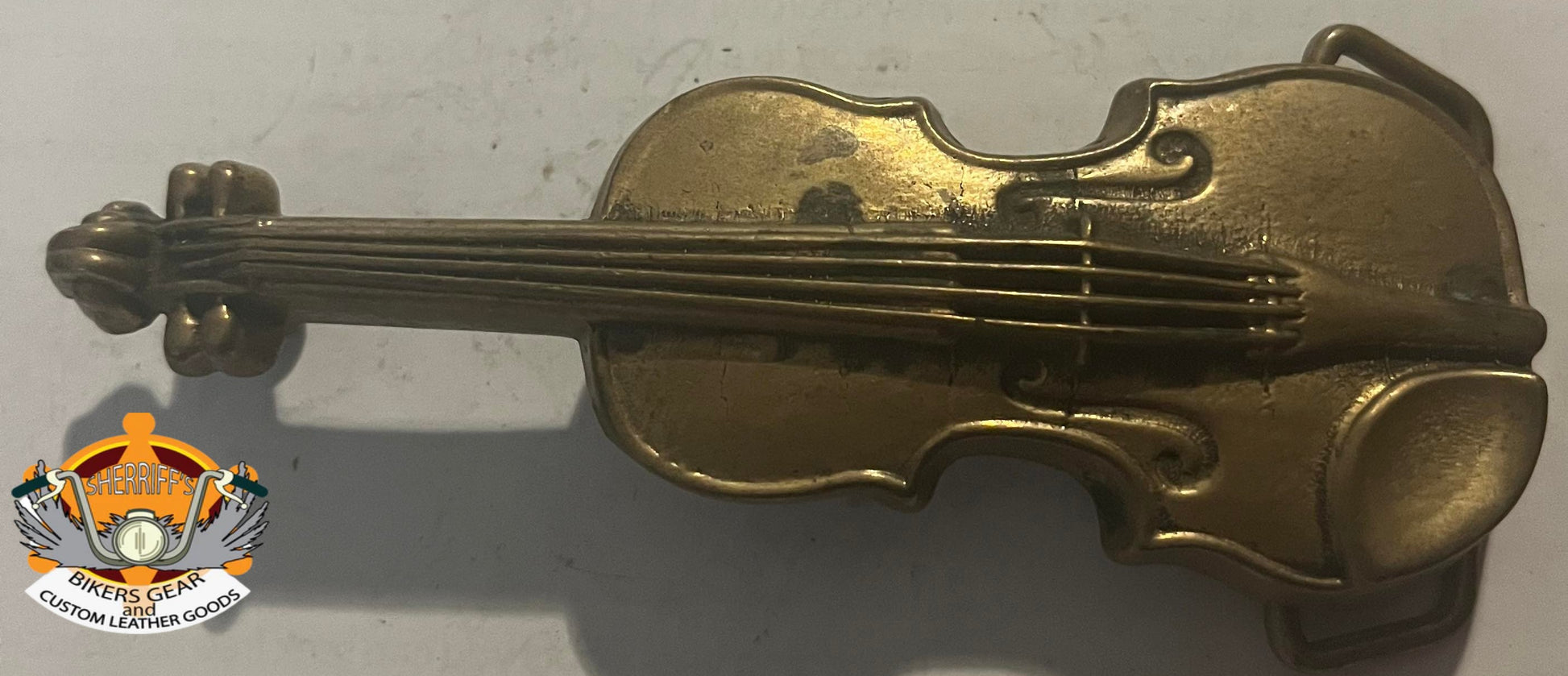 Brass violin belt buckle. Please note, this item is second hand, and there is some wear and tear to the buckle.