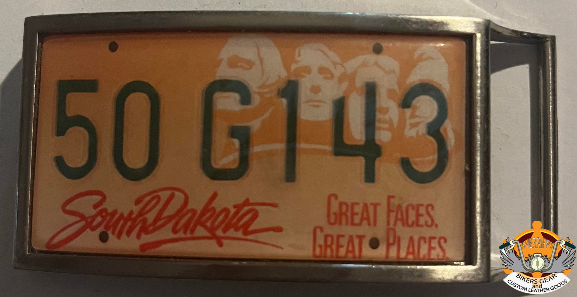 South Dakota number plate belt buckle. Please note, this item is second hand, and there is some wear and tear to the buckle.